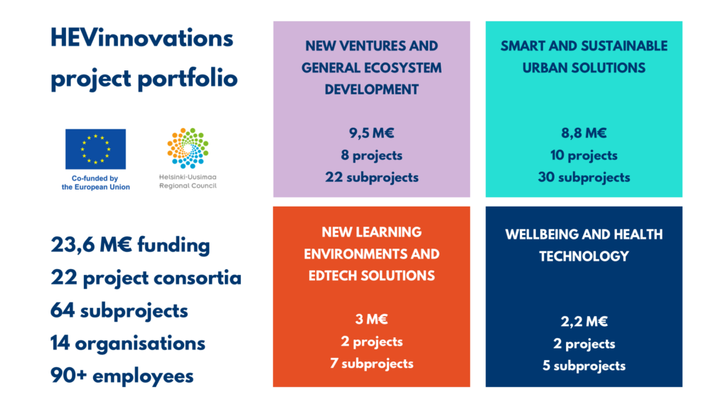 The HEVinnovations program focuses on smart and sustainable urban solutions, new ventures, and general ecosystem development. Also, new learning environments, edtech solutions, well-being and health technology are presented in our portfolio.