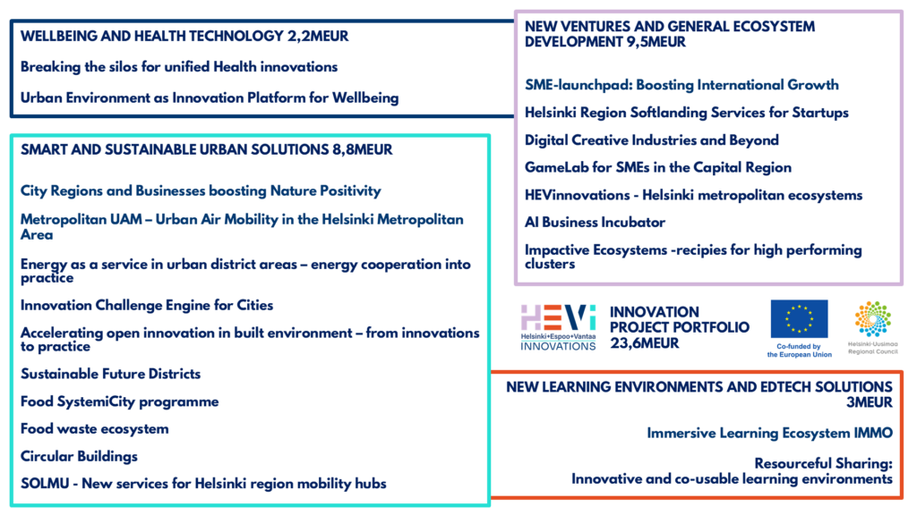 HEVi is a joint innovation programme by the cities of Helsinki, Espoo, and Vantaa, designed to strengthen innovation activities and networks across the Helsinki metropolitan area. The programme is based on an innovation ecosystem agreement with the Finnish government, through which the cities will develop an extensive project portfolio between 2021 and 2027. The projects are implemented between 2023 and 2029. The agreement promotes the strategic allocation of public and private RDI funding and supports the growth of globally competitive innovation ecosystems.